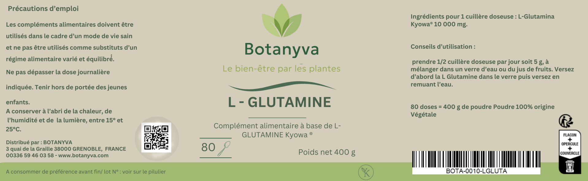 La L-Glutamine Kyowa® BOTANYVA est un acide aminé essentiel au bon fonctionnement de l’organisme, particulièrement reconnu pour son rôle dans la réparation de la muqueuse intestinale et le soutien du système digestif.