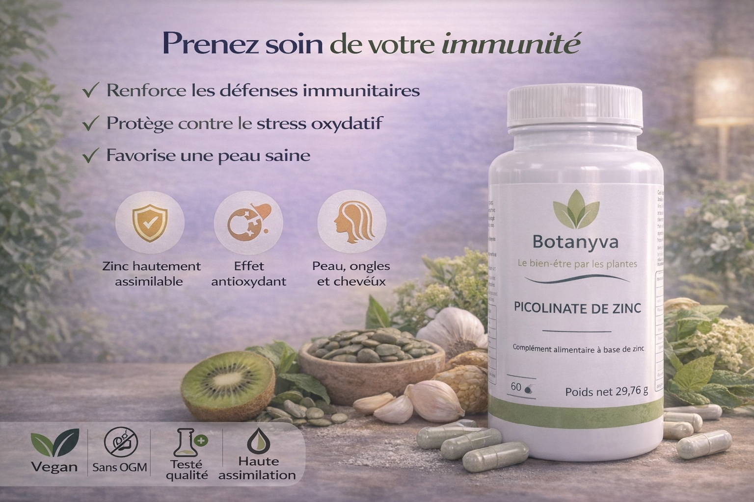 Le Picolinate de Zinc BOTANYVA est une forme de zinc reconnue pour sa biodisponibilité optimale, permettant une absorption efficace par l’organisme.